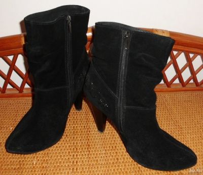 Б/у, в очень хорошем состоянии. Демисезонные черные женские ботинки ботильоны из натуральной кожи, внутри на байке, по бокам вставки из резинки. Замеры: стелька - длина 24 см и ширина 7.5 см, высота каблука 12 см, высота подошвы под носочной частью 2.5 см.